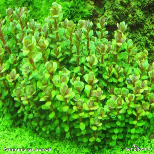 A Ammannia sp. 'Bonsai' é uma planta de caule única, muito apreciada por seu crescimento extremamente lento e compacto, que se assemelha a uma pequena árvore. Suas folhas são pequenas, arredondadas e densamente agrupadas no caule. Sob condições ideais, especialmente com iluminação forte e nutrição adequada, as folhas podem desenvolver uma bela coloração que vai do verde-oliva ao laranja-avermelhado. É uma planta de médio plano por excelência, perfeita para criar detalhes e pontos de interesse no layout. Devido ao seu crescimento lento, exige pouca manutenção e poda. No entanto, é uma planta exigente, que necessita de iluminação forte, CO2 e um regime de fertilização consistente para prosperar.