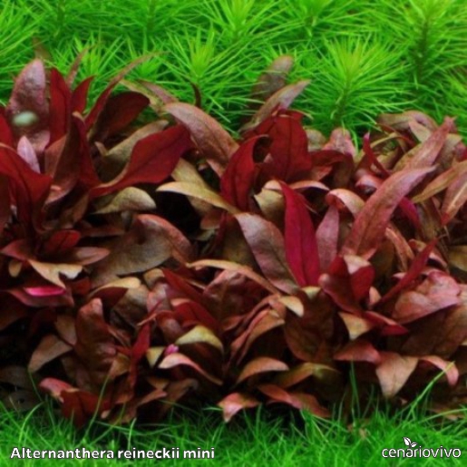 A Alternanthera reineckii 'Mini' é uma das plantas vermelhas mais populares do aquarismo, especialmente pela sua cor intensa e tamanho compacto. Esta variedade anã é perfeita para criar pontos focais de cor no primeiro e médio plano do aquário. Seu crescimento é lento e rasteiro, o que exige menos podas e facilita a manutenção do layout. Para atingir sua coloração máxima, que varia do rosa ao vermelho-vinho profundo, a iluminação forte, a injeção de CO2 e uma fertilização rica em ferro e micronutrientes são essenciais. Sem essas condições, a planta pode perder sua cor vibrante, tornando-se mais pálida ou esverdeada.