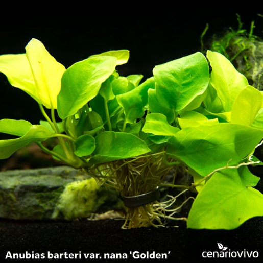 A Anubias barteri var. nana 'Golden' é uma variedade cultivada da popular Anubias Nana, selecionada por sua coloração única. Suas folhas novas nascem com um tom de amarelo-dourado ou verde-limão brilhante, que se destaca intensamente no aquário, especialmente contra fundos escuros ou plantas de tom verde mais fechado. Com o tempo e sob luz mais baixa, as folhas mais velhas podem escurecer um pouco, mas a planta como um todo mantém uma aparência clara e luminosa. Ela mantém a incrível resistência e o crescimento muito lento de sua parente, sendo perfeita para iniciantes e aquários low-tech. O rizoma deve ser fixado em troncos ou rochas. É uma das melhores plantas para adicionar um ponto de cor clara e duradoura ao layout com o mínimo de esforço.