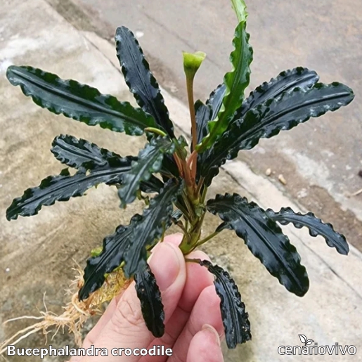 A Bucephalandra sp. 'Crocodile' é uma variedade rara e fascinante, nomeada pela textura única de suas folhas, que lembra a pele de um crocodilo. Suas folhas são alongadas e de um verde-escuro, com uma superfície rugosa e um padrão de nervuras que cria esse efeito distinto. É uma planta epífita de crescimento muito lento, ideal para colecionadores e para quem busca adicionar uma textura exótica ao hardscape. Assim como outras Bucephalandras, é resistente e se adapta bem a condições de baixa iluminação, tornando-a uma planta de baixa manutenção. Deve ser fixada em rochas ou troncos. Sua aparência única a torna um ponto de interesse visual imediato em qualquer layout.