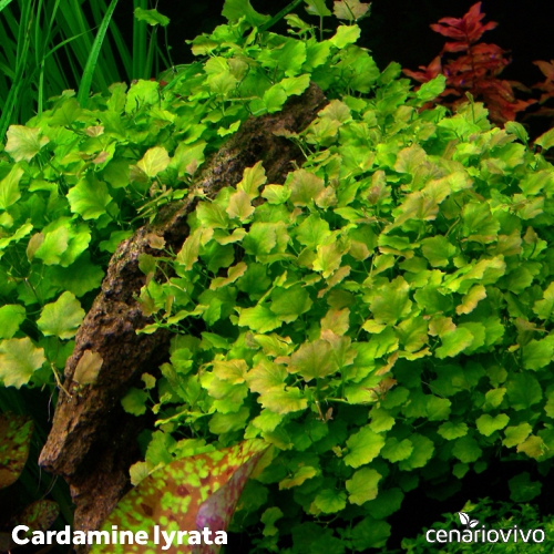 A Cardamine lyrata, conhecida como Trepadeira Japonesa, é uma planta de caule de aparência extremamente delicada e ornamental. Suas folhas verdes e em formato de rim ou trevo crescem ao longo de uma haste fina, criando um efeito de cortina ou trepadeira muito gracioso no aquário. É uma planta versátil que pode ser usada no fundo, onde suas hastes longas criam um belo pano de fundo, ou até mesmo no médio plano, onde pode ser guiada para crescer sobre troncos e rochas. Prefere temperaturas mais amenas e se beneficia de uma boa nutrição e CO2 para um crescimento mais vigoroso e folhas mais cheias. Seu crescimento rápido a torna uma boa opção para aquários em fase de ciclagem, ajudando a absorver o excesso de nutrientes.