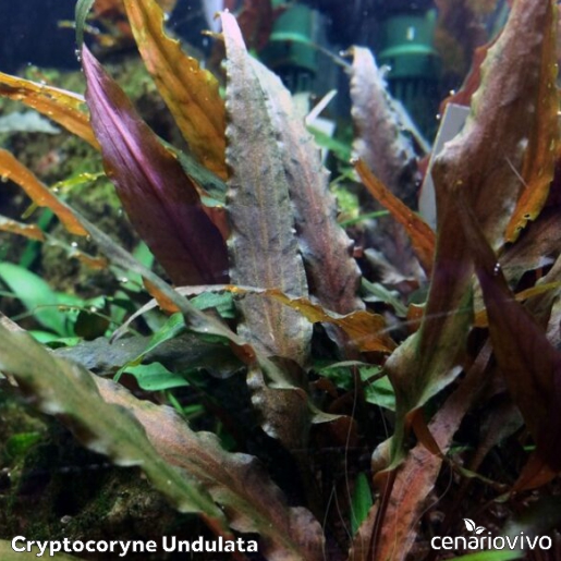 A Cryptocoryne undulata é uma planta muito resistente e adaptável, ideal para iniciantes no mundo das Cryptocorynes. Suas folhas são lanceoladas, com as bordas distintamente onduladas (undulata). A coloração é variável, indo do verde-oliva ao marrom-avermelhado, muitas vezes com um padrão de listras escuras. É uma excelente planta para o plano médio, onde forma moitas densas com o tempo. Como outras Cryptocorynes, é pouco exigente em relação à luz e CO2, mas necessita de um substrato rico em nutrientes para prosperar, pois se alimenta primariamente pelas raízes. É conhecida por sua robustez e por se adaptar bem a águas mais duras. Após o plantio, pode passar por um período de adaptação (melt), mas uma vez estabelecida, é uma adição duradoura e de baixa manutenção.