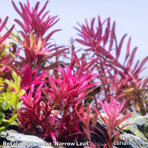 A Rotala macrandra 'Narrow Leaf' é uma variedade da exigente Rotala macrandra que, como o nome indica, possui folhas mais finas e estreitas. Esta característica lhe confere uma aparência um pouco mais delicada do que a forma padrão. Ela mantém a coloração espetacular de sua parente, com tons que podem ir do rosa ao vermelho-magenta intenso. Suas exigências também são as mesmas: é uma planta de alta tecnologia que necessita de iluminação muito forte, CO2 em níveis elevados e uma fertilização completa para prosperar. Qualquer deficiência nutricional resultará em folhas pequenas, pálidas ou com buracos. É uma planta de fundo que, quando bem cuidada, cria uma moita de cor e textura fina de beleza incomparável.