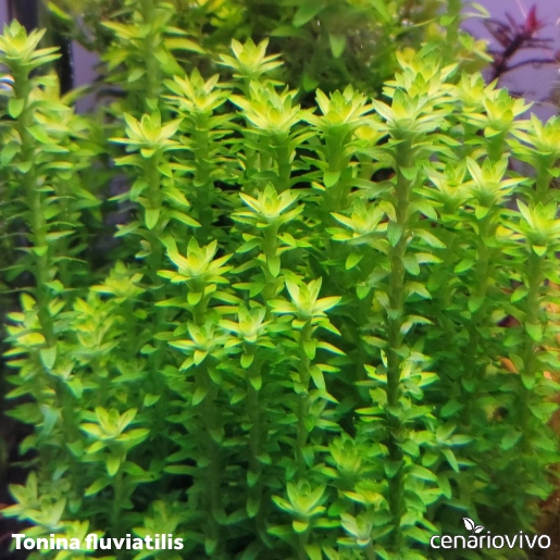 A Tonina fluviatilis é uma planta de caule exótica e muito cobiçada, conhecida por sua aparência única que se assemelha a pequenas estrelas ou pinheiros delicados. Suas folhas finas e pontiagudas crescem em verticilos densos ao redor de um caule fino, criando uma textura espetacular. No entanto, é uma planta notoriamente difícil de manter, sendo adequada apenas para aquaristas experientes com aquários high-tech bem estabelecidos. Ela exige condições muito específicas: água extremamente mole e ácida (baixo kH e gH, pH abaixo de 6.8), iluminação forte, injeção de CO₂ em níveis elevados e um substrato rico em nutrientes, além de fertilização líquida completa. É muito sensível a flutuações nos parâmetros da água. Quando suas necessidades são atendidas, ela recompensa com um visual incomparável.